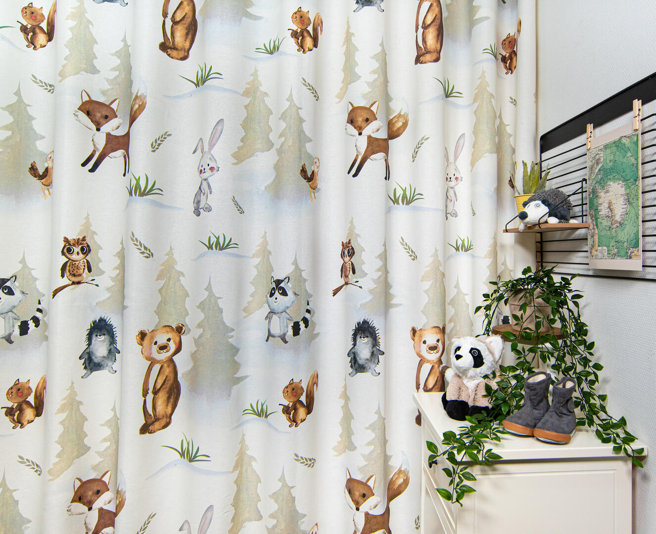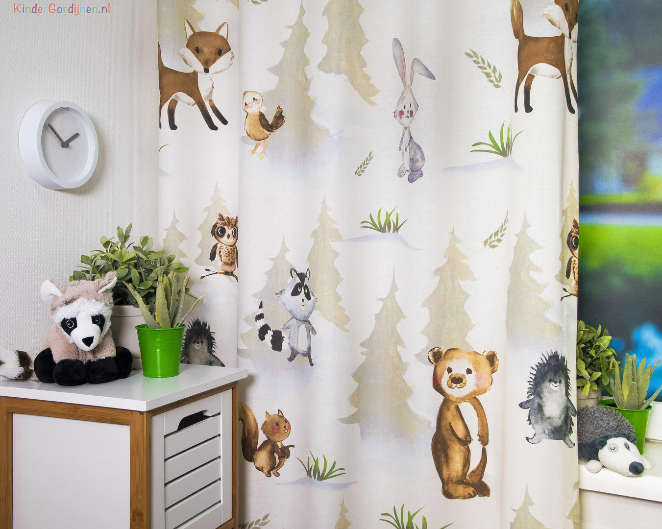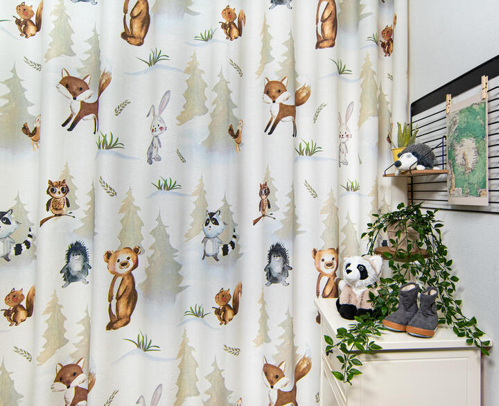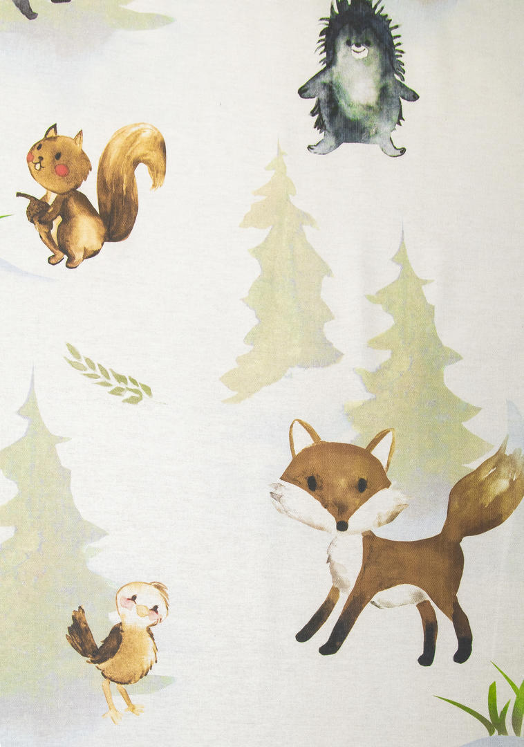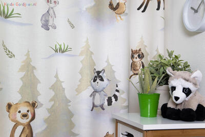 Een kindergordijn om te koesteren, wat een pláátje! De bosdieren lijken door de realistische aquareltechniek, haast handmatig op het gordijn aangebracht. Een verfijnde penseeltechniek met een zacht kleurgebruik. De dieren kijken je vrolijk en guitig aan en hebben zin in het leven, dat straalt er vanaf! Het patroon is royaal, waardoor je dit gordijn ook prima tot de grond kunt laten maken. De mus is 13 cm groot en het konijn 25 cm. De print is aan de voorzijde gedrukt op matte, fijn geweven stof. Voor extra verduistering kun je optie voeren aanvinken in het bestelproces. Wat een plezier om de kinderkamer binnen te komen met dit gordijn!